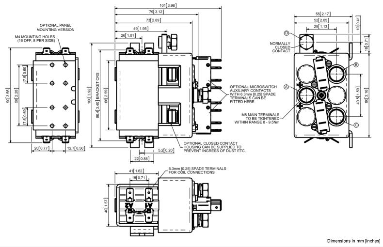 用于电机反转的主触点电路具有内置的故障安全保护装置,因此如果两个线圈同时通电,则触点装置是开路的。DC88具有双重断开的主触点和银合金触点尖端,这些触点具有耐焊接性,耐磨损性和导电性能优异。DC88 M8主螺柱端子可以通过多种方式进行配置,以适应应用。线圈连接采用6.3mm黑桃,并通过随附的支架进行安装,可以水平或垂直安装,垂直时M8接触螺栓应朝上。如果要求向下定位,我们可以调整接触器来弥补这一点。