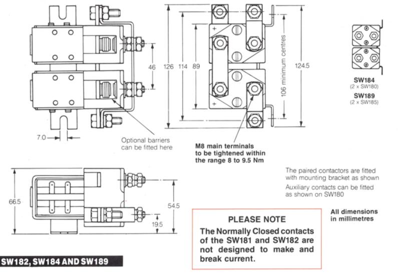 SW184采用单刀单掷,双断主触头,银合金尖头,耐焊接,耐磨,导电性能优良。SW184具有M8螺柱主端子和6.3mm铲形线圈连接。它可以通过M5螺纹孔或安装支架安装 - 可以提供安装,也可以作为单独的项目安装。安装时可以是水平或垂直,垂直时M8接触螺柱应朝上。如果要求是向下定向,我们可以调整接触器以补偿这一点。