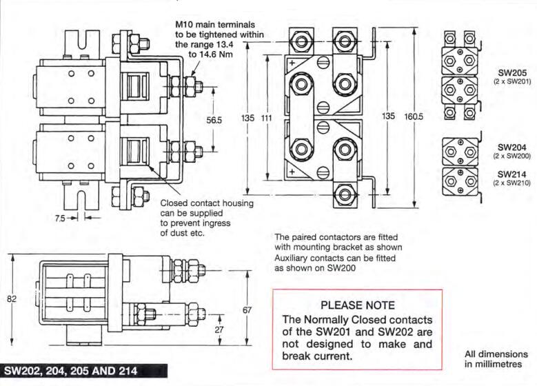 主触点电路设计用于电机反转,具有内置故障保护功能,因此如果两个线圈同时通电,则触点装置是开路的。SW205采用单刀双掷,双断合主触头,银合金尖端,耐焊接,耐磨,导电性能优良。SW205具有M10螺柱主端子和6.3mm铲形线圈连接。它可以通过M5螺纹孔或安装支架安装 - 可以提供安装,也可以作为单独的项目安装。安装可以是水平或垂直,垂直时M10接触螺柱应朝上。如果要求是向下定向,我们可以调整接触器以补偿这一点。