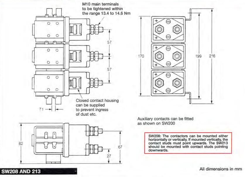 SW208采用3 x单刀单掷,双断主触头,银合金尖端,耐焊接,耐磨,导电性能优良。SW208具有M10螺柱主端子和6.3mm铲形线圈连接。它可以通过M5螺纹孔或安装支架安装 - 可以提供安装,也可以作为单独的项目安装。安装可以是水平或垂直,垂直时M10接触螺柱应朝上。如果要求是向下定向,我们可以调整接触器以补偿这一点。