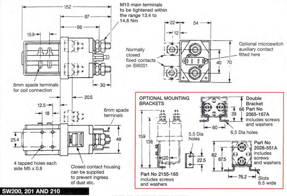 SW210采用单极单掷,双断主触头,银合金尖端,耐焊接,耐磨,导电性能优良。SW210具有M10螺柱主端子和6.3mm铲形线圈连接。它可以通过M5螺纹孔或安装支架安装 - 可以提供安装,也可以作为单独的项目安装。安装可以是水平或垂直,垂直时M10接触螺柱应朝上。如果要求是向下定向,我们可以调整接触器以补偿这一点。