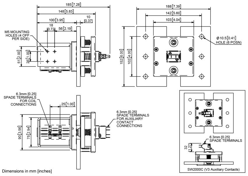 SW2400具有双重断裂的主触点和银合金尖端,这些尖端具有耐焊接性,耐磨损性和优异的导电性。主触点上的镀银是SW2400的标准配置,但是,也可以将其从规范中排除。这种紧凑型接触器可以垂直或水平安装母线,但是如果垂直安装,线圈应位于底部。可选附件包括辅助开关,支架,线圈表面处理和磁性锁定 - 这可以使接触器保持闭合状态,同时不消耗线圈功率。