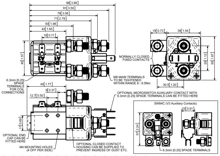 SW84的特点是单极双重断开主触点,银合金尖端,耐焊接,耐磨损,并具有优异的导电性。 SW84具有M8螺栓主端子和6.3mm的黑色线圈连接。 通过M4螺纹孔或安装支架进行安装,或者提供安装,或作为单独的物品。 安装可以是水平或垂直的,垂直时M8接触螺栓应该朝上。 如果要求向下定位,我们可以调整接触器来补偿这一点。